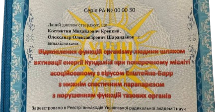 Докладніше...Відновлення функцій організму людини шляхом активації енергії Кундаліні при поперечному мієліті асоційованому з вірусом Ебштейна-Барр з нижнім спастичним парапарезом з порушенням функцій тазових органів. …