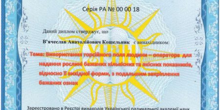 Докладніше...Використання торсійного поля людини - оператора для надання рослині бажаних кількісних та якісних показників, відносно її вихідної форми , з подальшим закріплення даних ознак. …