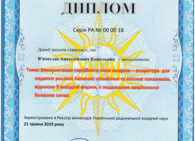 Для збереження такого важливого ресурсу, як час , та можливості безпосереднього корегування росту і розвитку рослини в процесі її формування, як нового сорту , було використано метод впливу торсійних полів людини-оператора .