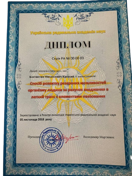Формула відкриття «Спосіб розвитку резервних можливостей організму людини за рахунок входження в легкий транс з елементами навіювання».
